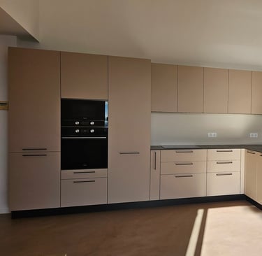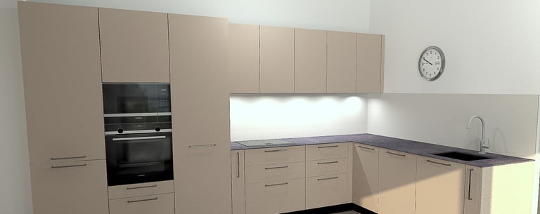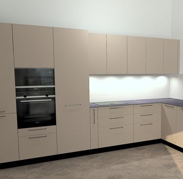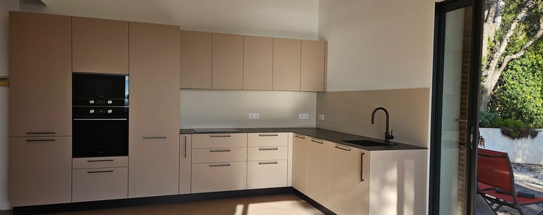 Les façades beige mat s’associent à un plan de travail noir et une robinetterie assortie pour un rendu épuré et contemporain.