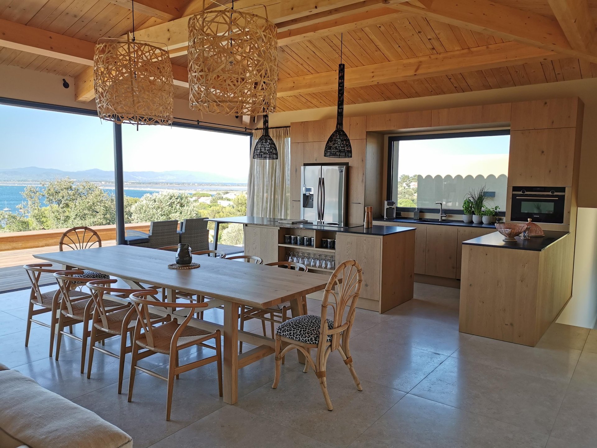Les façades bois clair, les poignées noires et les éléments en inox créent un bel équilibre entre style rustique et modernité.