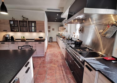 Le grand piano de cuisson et l’îlot central renforcent l’aspect convivial de la pièce, pensée pour recevoir et cuisiner sans contrainte.