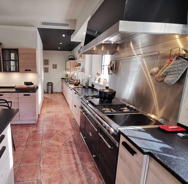 Cette cuisine s’intègre parfaitement dans une maison de caractère, avec ses matériaux chaleureux et son sol en terre cuite d’origine.