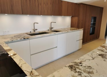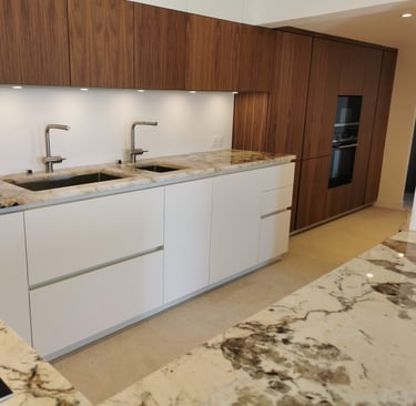 Les meubles blancs apportent une vraie sensation d’espace et de clarté, parfaitement équilibrée par les touches de bois foncé et le plan de travail marbré.