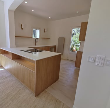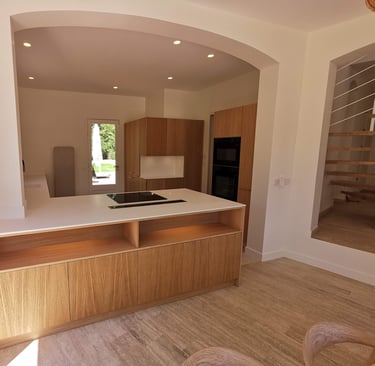 Le bois clair et les façades sans poignées offrent un rendu naturel et épuré, parfaitement intégré dans l’architecture existante.