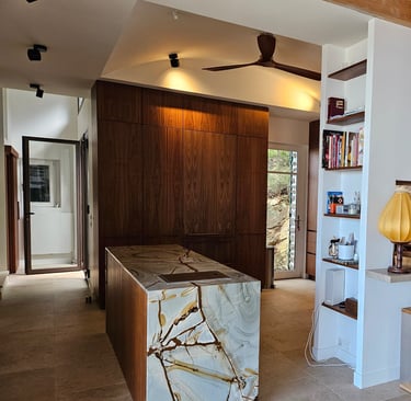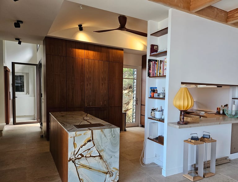 Cette cuisine se distingue par son alliance audacieuse : des menuiseries en noyer sombre et un îlot en pierre naturelle, aux veines bleu-gris et ocre, traité comme une véritable œuvre d’art.